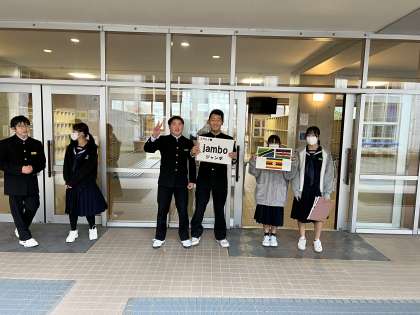 あいさつ運動2日目の活動です。きょうのあいさつはスワヒリ語です。
