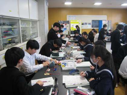 2年の理科では、「回路の違いによって、流れる電流はどのように変化するか」という学習課題のもとに、班別で実験を行っていました。