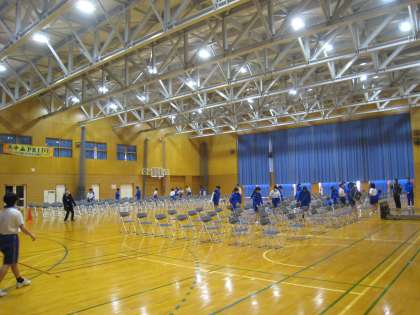 体育館では、午後から行われる新入生説明会の準備をしていました。