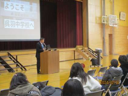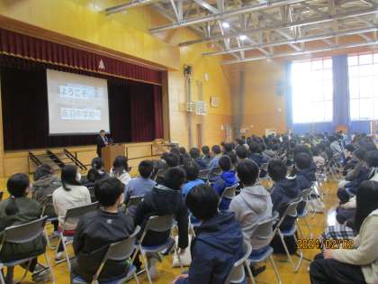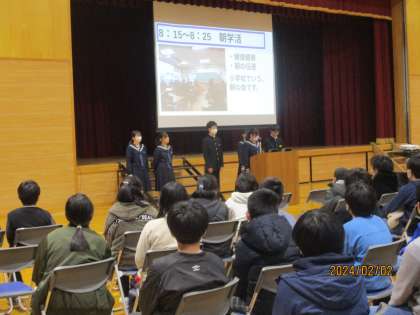 校区と校k外を含め、合計13の小学校から新入生が集まり、説明会が行われました。校長の挨拶の後、生徒会のメンバーから学校生活について説明がありました。