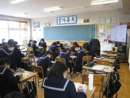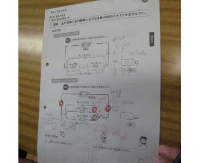 2年の理科では、直列回路と並列回路における全体の抵抗の大きさを求める問題に取り組んでいました。生徒たちは、教え合いながら協力して考えていました。