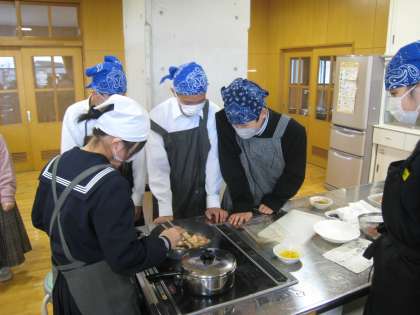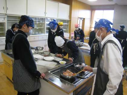 1年の技術家庭では、調理実習で、班ごとに豚の生姜焼きを作っていました。