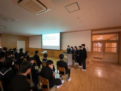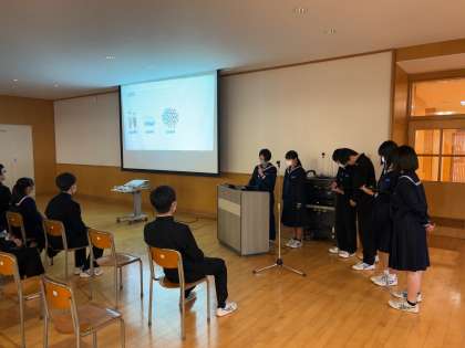 戦争について追求した学習内容をスライドにまとめたものを、各クラス代表のグループが発表しました。