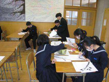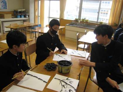 2年の美術では、筆と墨汁を使って、竹を描いていました。