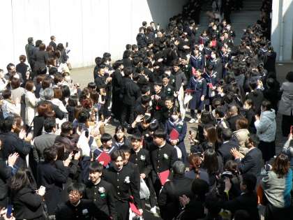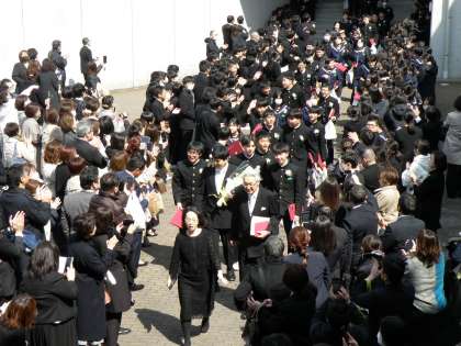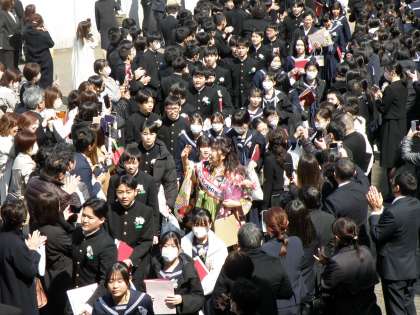 晴天の空のもと、卒業生が在校生・教職員・保護者に見送られました。