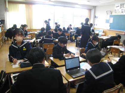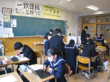 1年の学活では、来年度の新入生へのアドバイスを班ごとに考えていました。