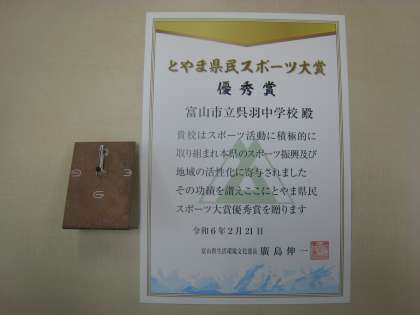 日頃のスポーツ活動への取り組みが評価され、本校は「富山県民スポーツ大賞 優秀賞」を受賞しました。部活動やクラブ活動を始め、みなさん一人一人の頑張りがあってこその受賞です。今後も努力し続ける姿勢を忘れず、ますますの活躍を期待しています!