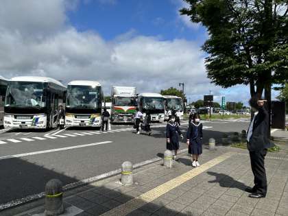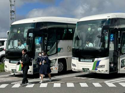ただ今、多賀SAでトイレ休憩と京都班別学習の行き先別にバスの乗り換えをしています。