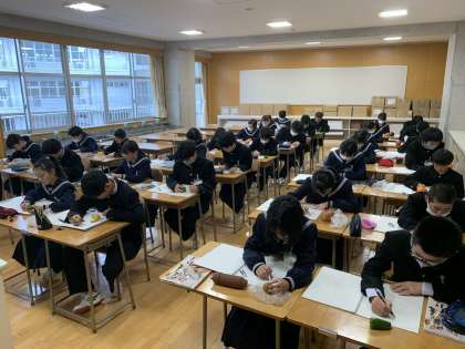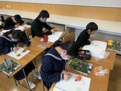 美術の授業です。家から持ってきた果物や野菜をもとに、デザイン画を描きます。今はその最初の段階のスケッチをしています。(写真は1年5組)