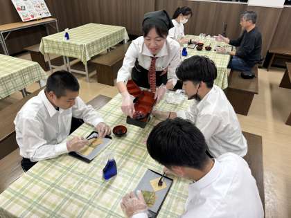 八ツ橋について歴史を聴き、その後実践です。思い思いの餡を置いて作ります。