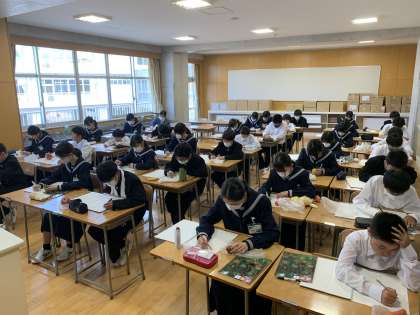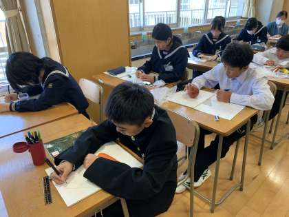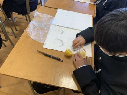美術の授業です。家から持ってきた野菜や果物をスケッチしています。この絵を元にデザイン画を描く予定です。※保護者の皆様、野菜や果物を用意していただき、ありがとうございました。