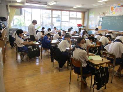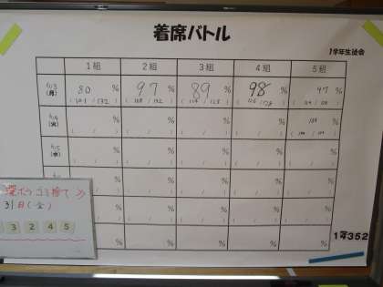 中 学年生徒会で「3分前着席」の呼びかけをしています