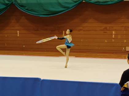 団体競技に続き、個人競技が行われています。今年度は、フープとリボンです。指先まで意識した演技に、観客の皆さんも惹き付けられています。