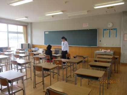 修学旅行の思い出について、ALTのケデシュ先生に英語で伝えるスピーチ大会が行われています。緊張していますが、一人一人が一生懸命伝えようと頑張っています。