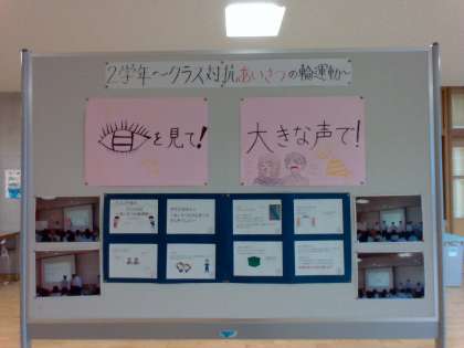 「クラス対抗 あいさつの輪運動」では、「目を見て!」「大きな声で!」を合言葉に、10日間朝のあいさつ運動を行います。