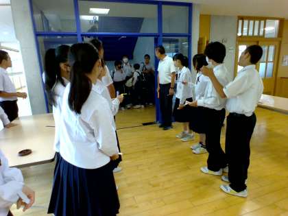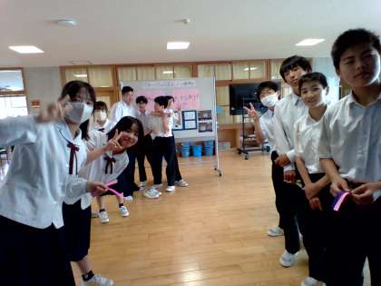 前日の終学活に学年放送で公開抽選をし、選ばれた5人と選ばれた先生1人が翌日の朝に学年フロアに立ち、よいあいさつをした人に特製「折り紙」を渡しています。10日間で各クラスで集めた「折り紙」の長さを競います。