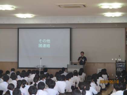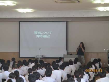 体育大会の実行委員会(実行委員、団リーダー、デコレーション)の人数編成が決まりました。実行委員会に立候補した生徒は、授業の初めと終わりの挨拶をはきはきしたり、時間を見て行動したりなど、リーダーになる人としてふさわしい姿を見せて欲しいといった話がありました。