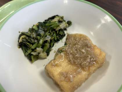 今日の揚げ出し豆腐は、肉みそ餡がかかっているものでした。この肉みそがミソなんですよね。やる事がにくいですね。