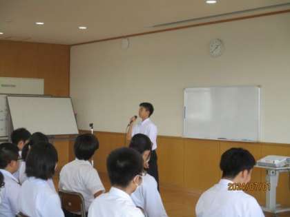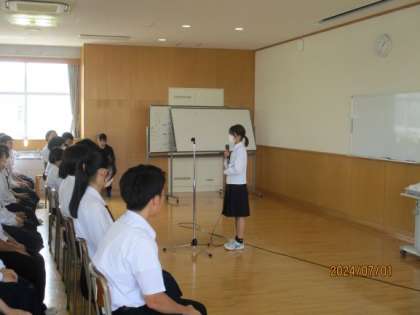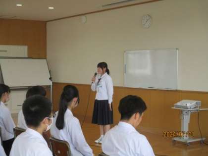 体育大会の実行委員を決める投票に向けて、実行委員立候補者による立ち会い演説会が行われました。それぞれ意気込みを堂々と話していました。