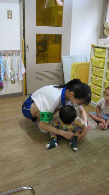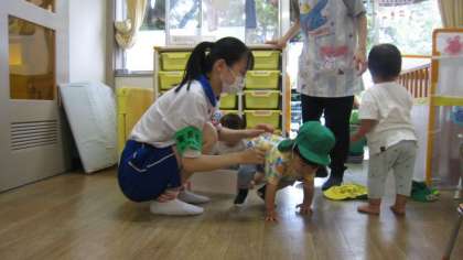 0.1歳児クラスの子供たちのお散歩の準備を手伝いました。