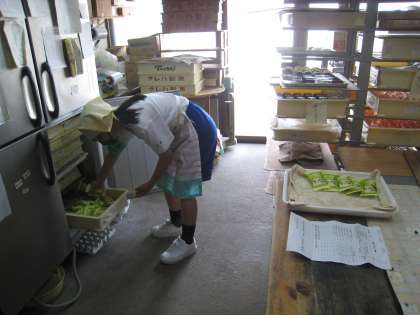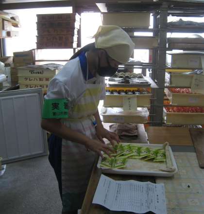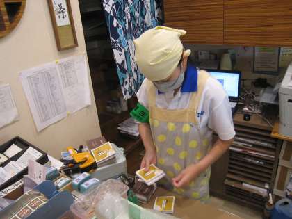 くれは製菓ではお菓子を入れる箱づくりやつくられた団子を詰めていました。
