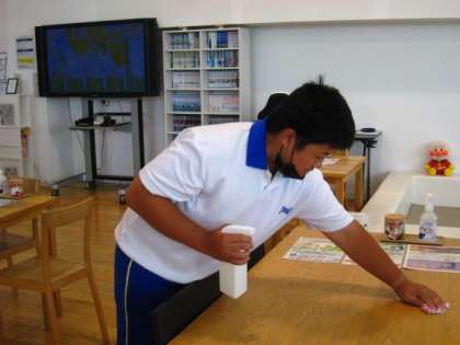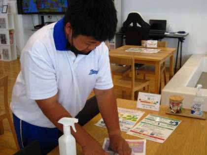 受付カウンターで待機しました。使用済みテーブルやパンフレットの消毒を行いました。