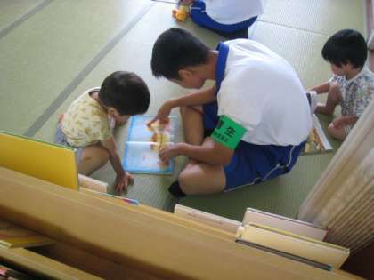 寒江保育所で活動しています。何度せがまれても読んで粘り強く対応しています。