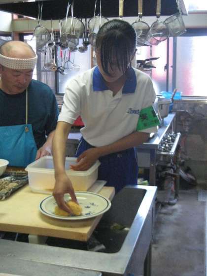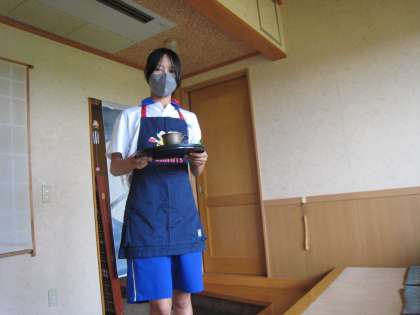 開店前は準備、開店後はお客様にご飯を運んでいます。