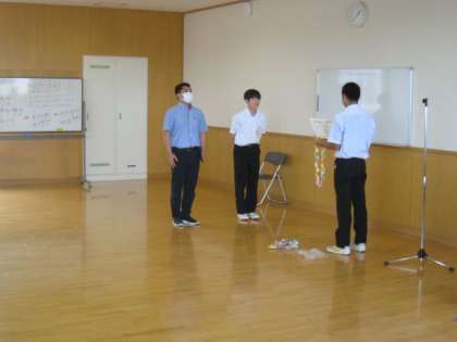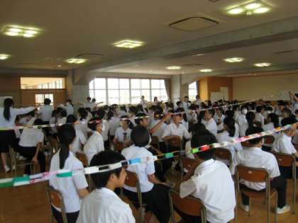 クラス対抗で、あいさつ運動の輪っかの長さを競い合いました。優勝は2年5組でした。