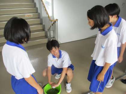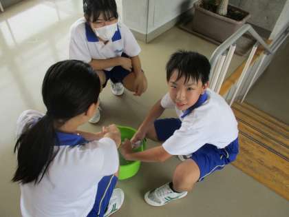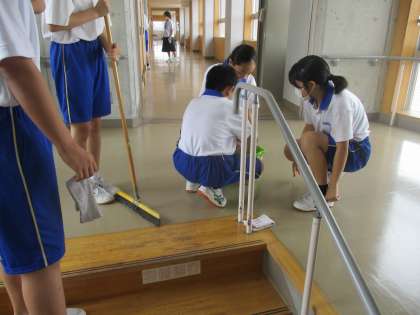 廊下掃除は暑いですが、丁寧に作業に取り組みます。