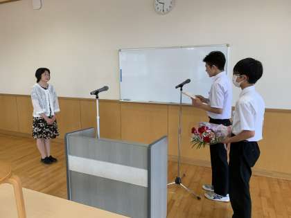 校長先生から、夏休み中には、頭(読書)、体(食事)、心(お手伝い、ボランティア)の栄養を摂ってくださいとのお話がありました。また、先生の離任式を行いました。今までお世話になりまして本当にありがとうございました。