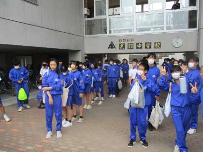 学校から梨畑まで移動し、何の収穫の仕方を学び