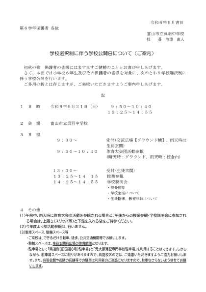 下記のとおり、学校選択制に伴う学校公開を行います。右側の配付文書にも掲載してあります。