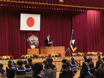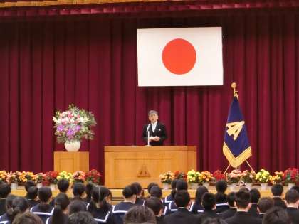 校長式辞では、「新入生の皆さんには、不確かな社会を生き抜くための力を付け、新たな時代を築く世代となってほしい。そのために、本校の校訓に挙げている言葉、知識と経験を生かし、正しい行動・判断をする力「聡明」、新しい一歩を踏み出す、何かを継続する姿勢「勇気」、奇跡的に脈々と受け継がれた命を大切にし、自他を尊重する心「友情」を意識して生きてほしい。たとえばコロナウィルス感染症に関しては、今後も様々なことが想定されるが、憶測で差別や偏見をもったり、無責任な発言、SNSの書き込みをしたりすることなく、正しい情報に基づき思いやりをもっていってほしい。」という言葉がありました。