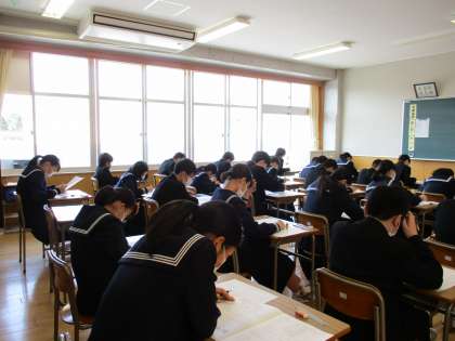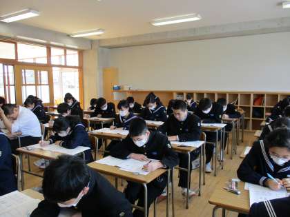 1学年の学習を確認するテストです。解答用紙にペンを走らせる音だけが響いています。