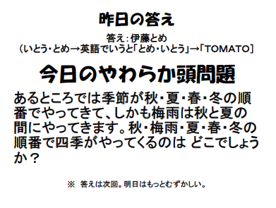 4月23日(木)今日のやわらか頭問題 公開日 2020/04/23 更新日 2020/04/23 お知らせ 昨日の問題は解けましたか? 今日の問題は、地理や理科の問題というより、どちらかというと国語の問題です。