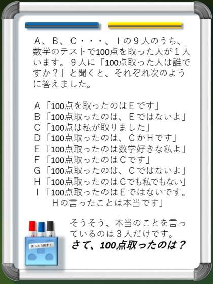 一つ一つの情報を整理したり予想したりして課題に取り組むことも、数学で身に付けてほしい大切な力です。「100点を取ったのは誰か?」時間があるときに、考えてみてくださいね!