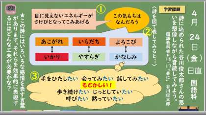 さて3学年2回目の国語は谷川俊太郎さんの「春に」という詩です。教科書の冒頭部分にあり、授業では一番最初に学習するところです。谷川俊太郎さんは一体どんな思いでこの詩を書いたのでしょうか?いろいろと想像しながら読み進めると詩の世界が広がっていきます。また、音読をする際の工夫も考えられるといいですね!ちなみにこの詩は合唱曲にもなっています。ぜひ調べて聞いてみてください♪