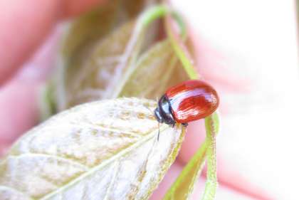 藤棚にあるフジの葉を食べる植食性昆虫(しょくしょくせいこんちゅう)のフジハムシです。甲虫(こうちゅう)の一種でカブトムシやクワガタ等の種類に近い仲間です。成虫の大きさは5〜7mm程度です。フジの葉が出てくると冬眠から目覚め、すぐに葉の裏へ産卵します。幼虫は黒っぽい色をしています。このフジハムシはフジの葉しか食べません。狭食性(きょうしょくせい)といい、フジがないと生きていけないのです。ハムシにはこのような性質を持つ仲間が多数います。人間のようにいろんなものを食べられるといいんだけどなあ〜。ハムシのような食生活の人はいませんか?