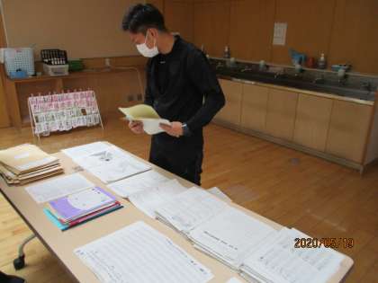 みなさんに提出してもらった課題をまず各担任で確認しています。各担任で教科ごとに分け、みなさんの頑張りを教科担当の先生方に見てもらおうと思います。