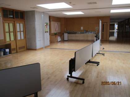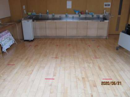 通路と手洗い待機場所を仕切っています。広いスペースは人が集まりやすくなるため、密集も防止したいです。しばらく休み時間は、教室内で過ごすことになるので、大切な手洗い場に手洗い以外で入らないようにしましょう。