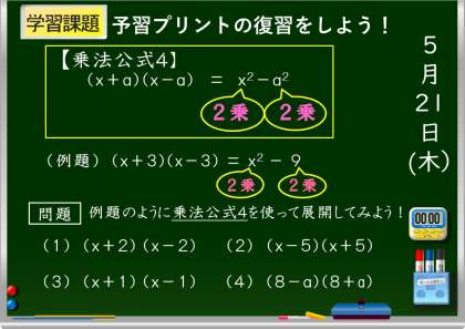 来週からの学校再開も決定し、楽しみにしている人も多いと思います。「乗法公式」も今回で全ての公式(1〜4)をホームページに載せることができました。数学の授業で、展開を勉強しますので、公式も見直しておきましょうね!