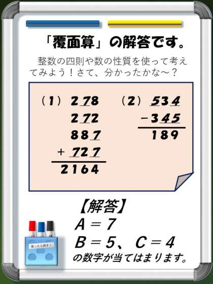 臨時休業中の「数楽しよう!」最後の解答です。数学はゲーム感覚でできる問題も多くあり、楽しい教科でもあります。謎解きや暗号等、興味をもった人は自分でも調べて取り組んでみましょう!