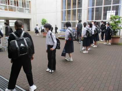 久しぶりの学校でした。生徒の皆さんの元気な姿が見られてとても嬉しかったです。生徒玄関では検温を行い、4階に上がって手洗いを済ませようやく各教室に・・・1限目の学活の時間には、校長先生から「人にうつさない、人からうつらない高い意識をもつ」「あらぬ噂をSNSで発散したりせず、自分以外の人のことを考えられるようにする」「友達に触れないでソーシャルディスタンスを保つ」3点について校内放送でお話がありました。生徒の皆さんも先生方の指示に従い、休憩時間も用のないとき以外は自席に着席し、読書をしたり勉強したりして、とても落ち着いて過ごしていました。
