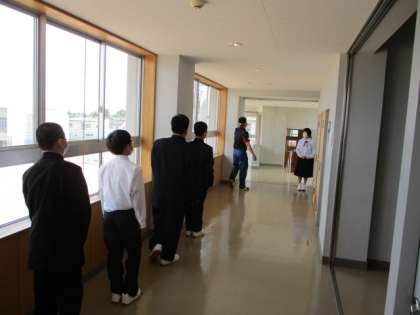 写真右2つは、学年棟以外でのトイレ使用をするクラスが確認に行く様子です。