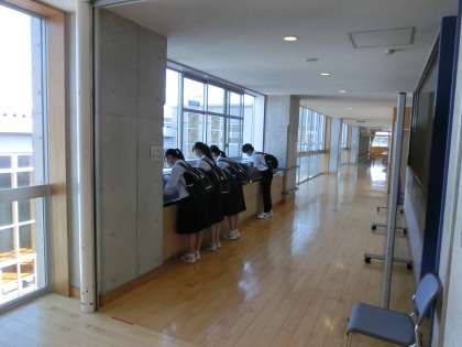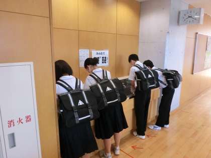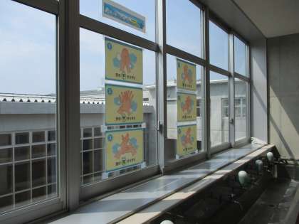 教室に入る前の手洗いもしっかり実行しています。洗面所等に手洗いのしかたを掲示するなどして、こうした実践が習慣化するよう努めています。帰宅後も手洗いをするようにしましょう。