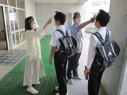 登校後すぐに生徒玄関前で検温をしています。37度をこえていないかドキドキ!