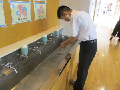 マスクを外してうがいをし、さらに手洗いをしています。まずは自分ができることから…