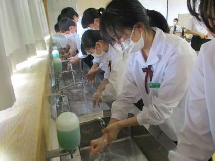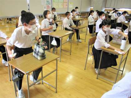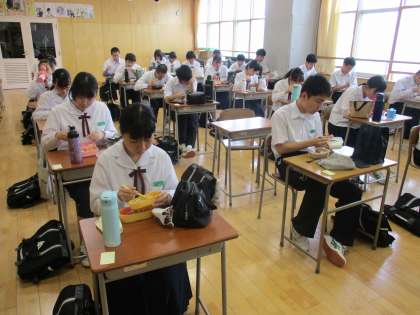1日登校となり、今日からは昼食時間にお弁当を食べています。食事前には丁寧に手洗いをし、自分の机をきれいにふき、いよいよ美味しいお弁当です。マスクを外すため、全員が前を向いて話をせずに食べています。グループで食べていた給食が懐かしいですね・・・