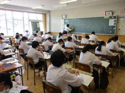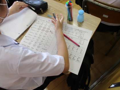 数学では「正負の数」について勉強しています。先生の話を聞きながら、一生懸命ノートをまとめている姿が見られました。